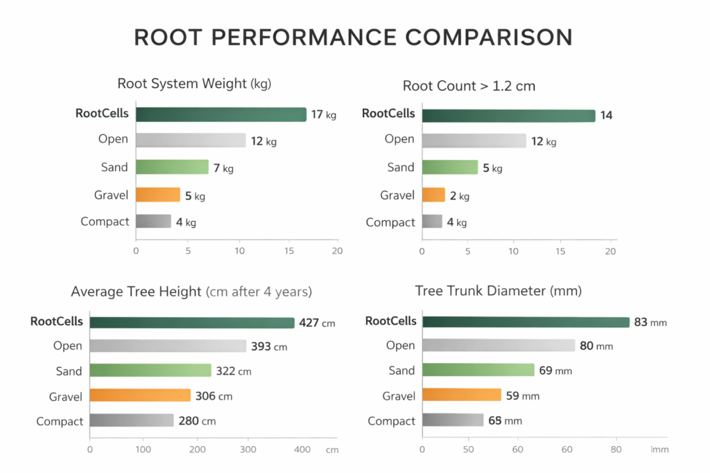 Systémy půdních buněk překonaly ostatní systémy ve všech důležitých metrikách růstu a zdraví stromů.